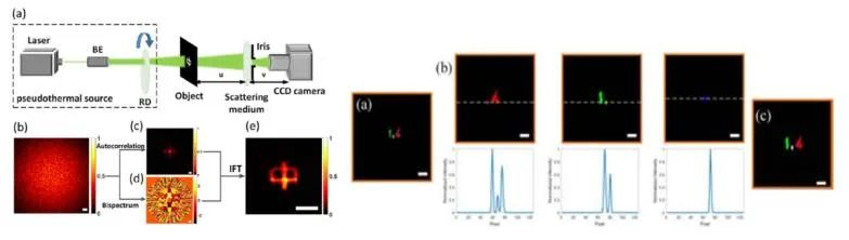 当我们做散斑高阶相关时,即傅里叶域中的双谱,可以确定性地恢复目标的傅里叶相位信息,而这些恰恰能够帮助我们识别目标的准确方向,并且利用这一特点,可以对目标进行“彩色”成像。