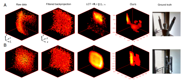 以上都是透过散射介质成像的例子,那么,反射可不可以呢?当然可以,这就是现在大家熟知的非视域成像了。研究人员已经做出了公里级的非视域成像装备,离应用越来越近。在高精度非视域成像方面,也可以实现毫米级成像分辨,较先前的工作,分辨率提升了一个数量级。