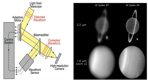 还有自适应光学的例子。由于介质内部折射率的不均匀分布,入射光在通过介质传输信号时会产生像差或者散射,从而直接影响成像质量,这种问题在天文成像或者生物成像中都会存在。解决此类问题的有效手段是自适应光学。
