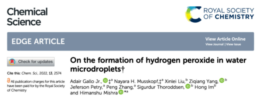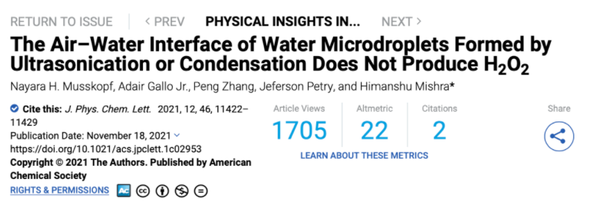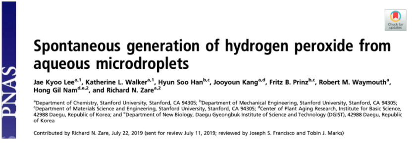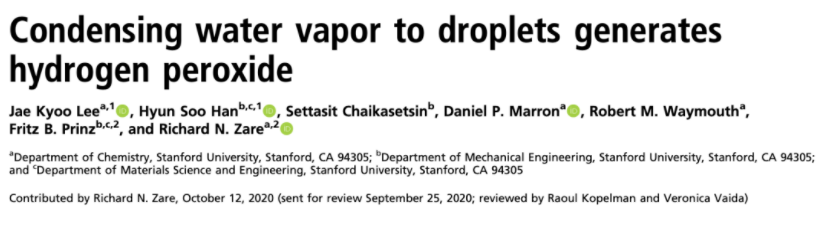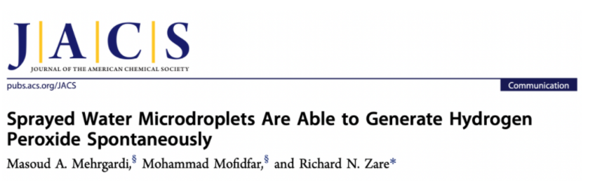 2020年11月23日,Zare团队再次在PNAS上发表论文,提出过氧化氢的形成,是由微滴的空气-水界面处的强电场引起的,因此不需要任何催化剂。