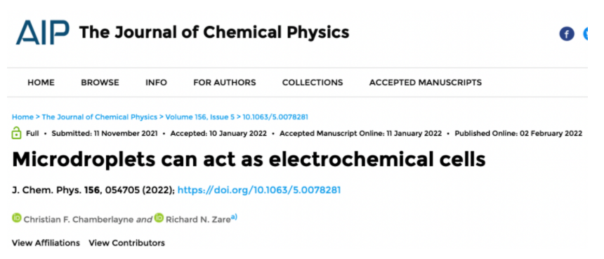 2022年2月2日,Zare团队发表论文,证明水微滴可以作为电化学微电池。