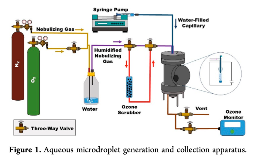 他们设计了一个装置,将超纯氮气通入水中鼓泡,同时将几乎不含有臭氧的气体通过加湿器注入一个密闭的腔室,在密闭腔室中将水通过二氧化硅(SiO2 )毛细管喷洒形成微滴。