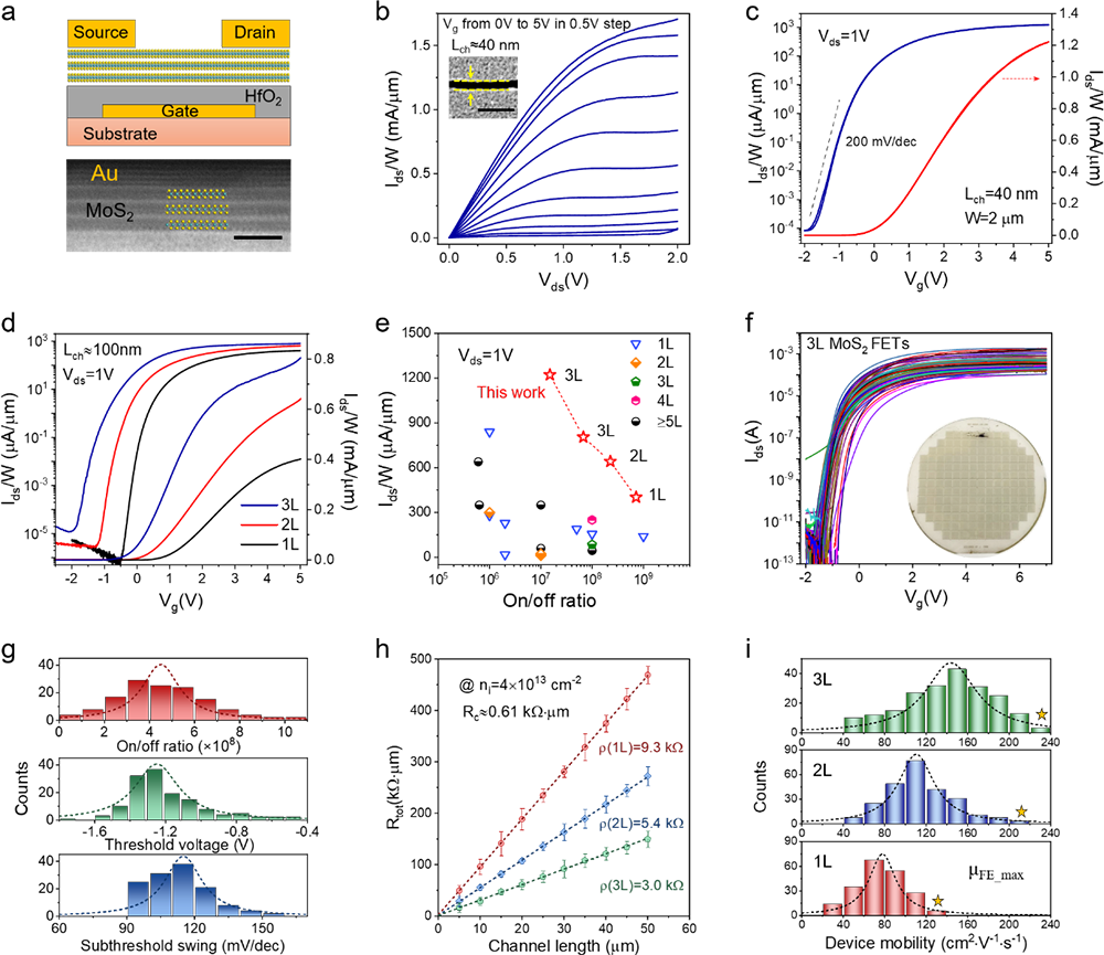 为了解决晶圆尺度多层二硫化钼逐层外延的问题,张广宇研究员课题组自主设计和搭建了4英寸多源化学气相沉积系统,发展了氧辅助的外延技术来调控生长动力学过程,利用蓝宝石(001)衬底的近邻效应克服了热力学的基本限制和逐层外延的困难,最终实现了4英寸晶圆尺度均匀多层二硫化钼连续薄膜(最高可达6层)的可控逐层外延生长。基于单层、双层及三层二硫化钼晶圆,他们加工了短沟道和长沟道的场效应晶体管器件并表征了器件的性能。电学测量结果表明,100纳米沟长的晶体管在驱动电压Vds=1V时的开态电流密度从单层的0.4 mA·μm-1提高到双层的0.64 mA·μm-1和三层的0.81 mA·μm-1,分别提高了60%和102.5%。对于40纳米沟长的三层二硫化钼短沟道器件,在Vds=2/1/0.65 V时的开态电流密度达到1.70/1.22/0.94 mA·μm-1的电流密度,为已报道的最高值,且具有超过107的开关比,优于国际器件与系统路线图(IRDS)中高性能逻辑器件的2024年目标。