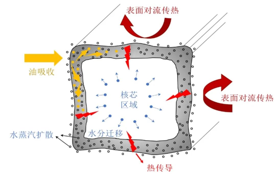 当薯条浸入油中时,热量从周围的高温油通过对流传热的方式传递给薯条,进而通过传导传热将热量传递给薯条内部。在这个过程中,薯条中的水以蒸气泡的形式从薯条表面蒸发并形成孔隙。