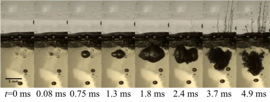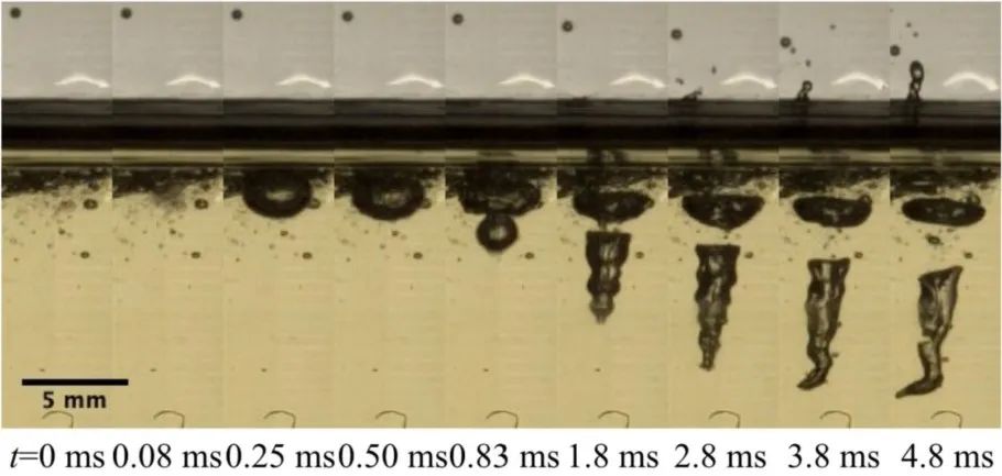 当气泡足够接近油表面而不会破裂时,会形成一个不对称的细长空腔,这种空腔的顶部比底部塌陷得更快。