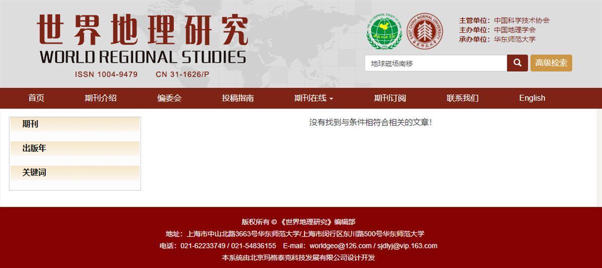 于是,极目新闻记者登上了《世界地理研究》的官方网页进行核实。在文章数据检索中并没有与“瑞典科学家KS、j和挪威科学家BQSTD”相关的条目,也没有类似“地球磁场南偏”这样的文章。而且根据记者长期关注国际新闻的经验来看,这几个科学家的名字也是非常奇怪,从来没有见过有像“BQSTD”这样的人名缩写。