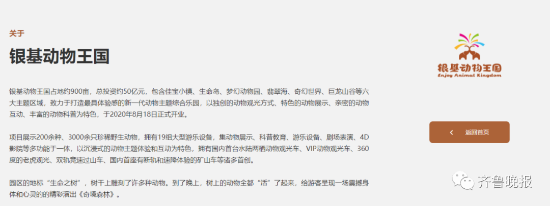 据官网介绍,银基动物王国占地约900亩,总投资约50亿元,包含佳宝小镇、生命岛、梦幻动物园、翡翠海、奇幻世界、巨龙山谷等六大主题区域,致力于打造最具体验感的新一代动物主题综合乐园,以独创的动物观光方式、特色的动物展示、亲密的动物互动、丰富的动物科普为特色,于2020年8月18日正式开业。