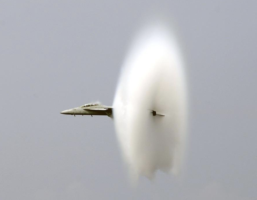 所以人们发现,只要当物体的速度足够快,以至达到超音速后,物体就可以冲过这道屏障。与此同时,物体周围也会产生一个强烈的冲击波,听觉上我们可以听到“啪”的爆炸声,视觉上有时还能看到一团锥形云。