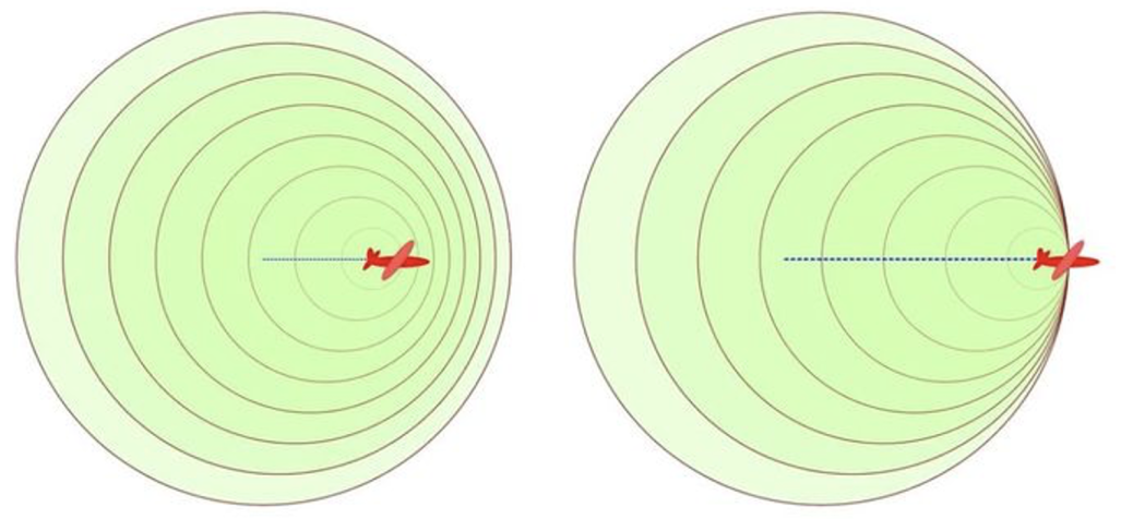 如果发声体固定不动且传声介质是完全均匀的,那声波传递的形式就会是规则的同心圆,但当发声体开始移动并不断加速时,发声体周围的声波就会呈现出一个锥形的立体声波能量场。如果新产生的声波与之前的声波进行叠加,声音也会变得更大。