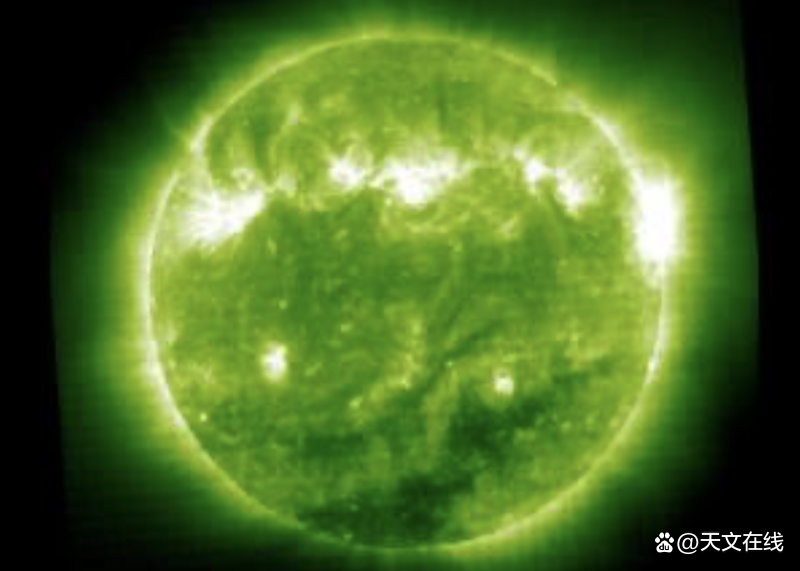 太阳在极紫外线下,呈现伪绿色。恒星看起来是绿色的吗?科学家不这么认为,但是观测者却很确信天秤座的氐宿四看起来是绿色的。图片来自SOHO/ESA/NASA。