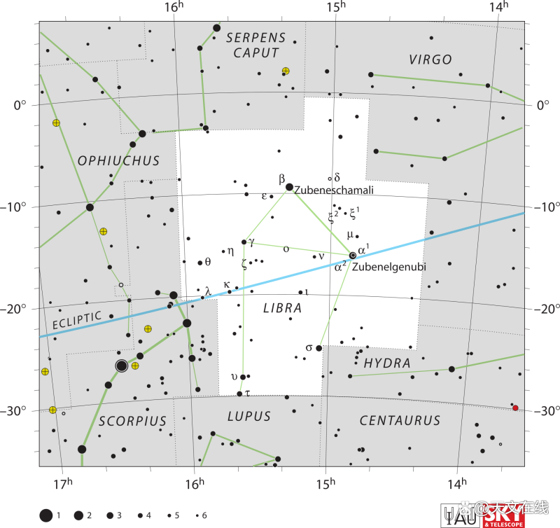 在天秤座中,氐宿一比天秤座另一颗明亮些的恒星氐宿四要暗淡。但氐宿四几乎位于黄道——太阳、月亮和众行星经过的路径。这可能就是为什么古代的观星者,给予了天秤座中的氐宿四α的称号。图像来源:国际天文联合会、Skyandtelescope.com (Roger Sinnott & Rick Fienberg)/ Wikimedia Commons.