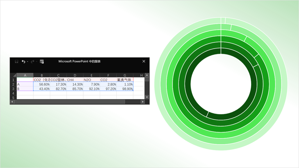 实现也简单,将圆环数据横向输入6个,A和B的数值和为100%。