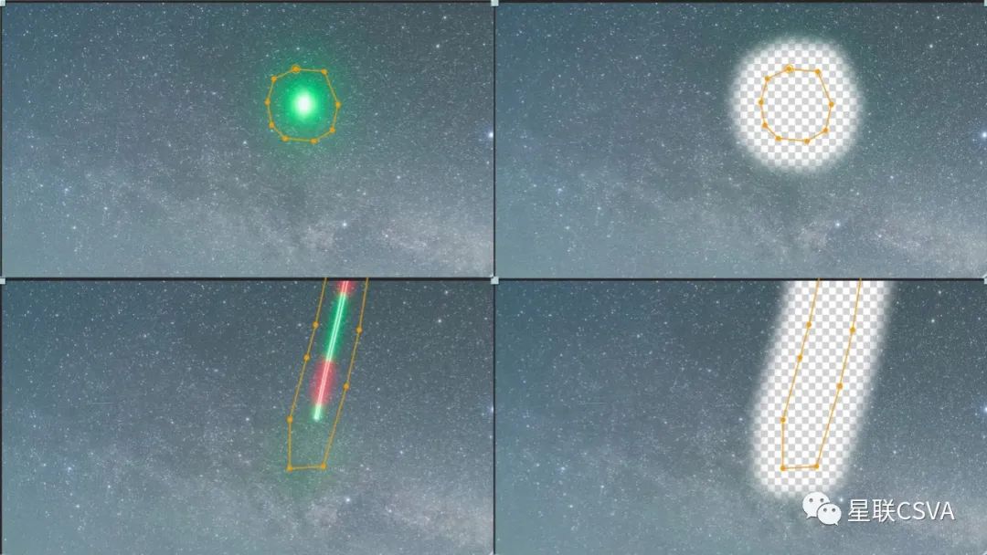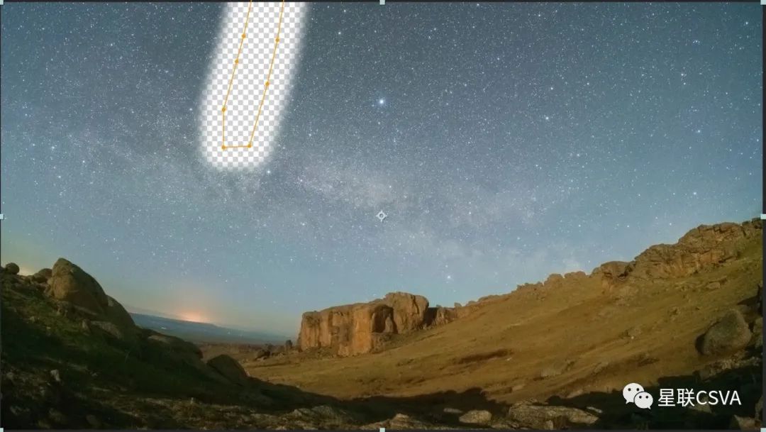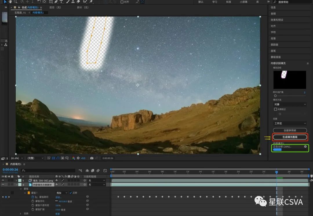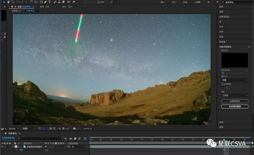 图中我们可以看到一条很长的红绿相间的线条,这个是分享者自己当时测试无人机拍摄星空不小心飞进了相机取景画面中;遇见这种情况我们可以在AE中使用内容识别填充进行修补: