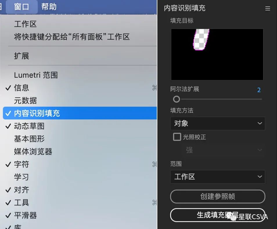 &&6- 如果在上图中找不到内容识别填充模块,那么在菜单栏-&窗口选项下检查<内容识别填充&是否处于勾选状态,勾选后即可: