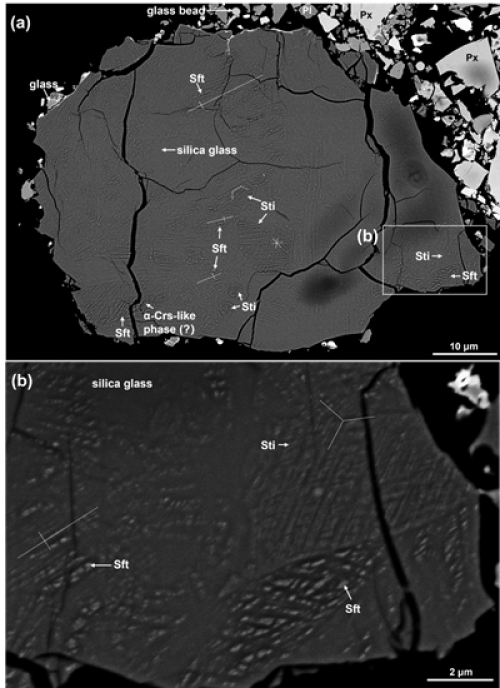 科研人员在一块嫦娥五号月壤粉末光片中发现了二氧化硅的两种高压相——赛石英和斯石英,这是首次在地外返回样品中发现赛石英。赛石英和斯石英出现在一块二氧化硅碎屑中,与之共存的还有似α-方石英的二氧化硅相及二氧化硅玻璃。其中,赛石英和斯石英均被不定形态的二氧化硅叶片有规律地切割,形成不同形式的格子结构,指示了它们的形成机制为固态相转变。