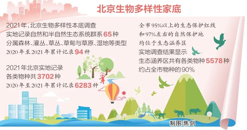 目前,北京已经完成了2020年至2021年的生物多样性本底调查工作。2021年,实地记录自然和半自然生态系统群系65种,分属森林、灌丛、草丛、草甸与草原、湿地等类型;2020年至2021年累计记录94种。