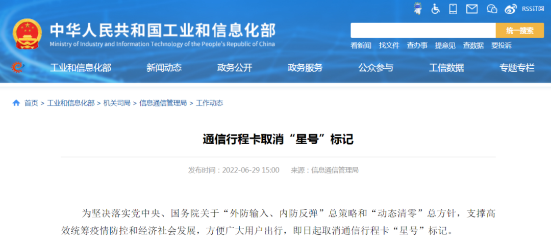 据工信部网站29日消息,为坚决落实党中央、国务院关于“外防输入、内防反弹”总策略和“动态清零”总方针,支撑高效统筹疫情防控和经济社会发展,方便广大用户出行,即日起取消通信行程卡“星号”标记。