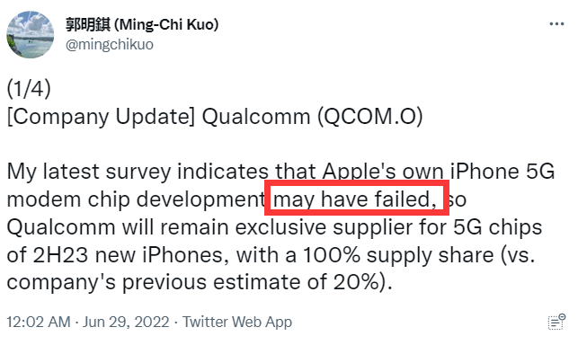 北京时间6月28日晚间,以预测苹果动态而知名的天风国际分析师郭明錤爆料,他最新的调查显示,苹果自研5G基带芯片(modem)的计划可能已经失败,这意味着到2023年新款iPhone上市时,高通仍将是新机型5G基带芯片的独家供应商。