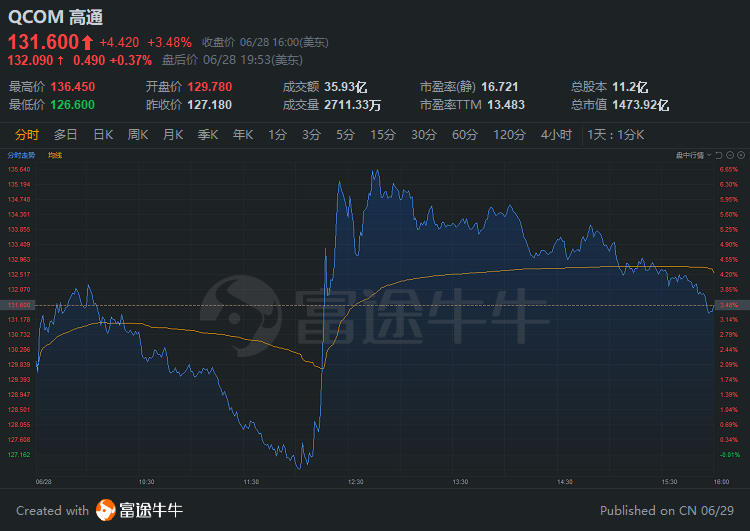 受相关消息影响,6月28日美股盘中,高通股价短线拉升近7%,最终收涨3.5%;苹果高开低走,最终收跌近3%。被传将为苹果自研5G基带芯片代工的台积电,收盘跌近2%。
