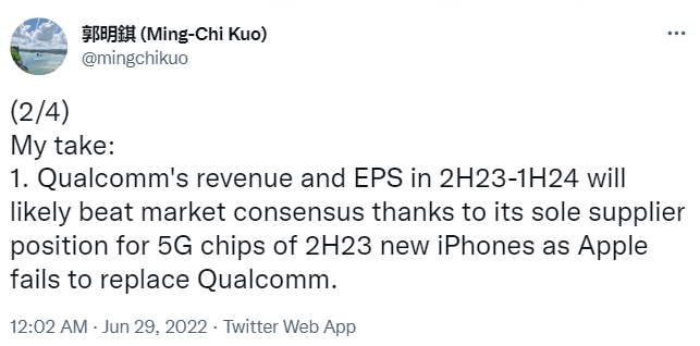 但郭明錤的最新爆料,意味着苹果自研基带出现更多不确定性。他在社交媒体上提到,由于目前苹果的基带无法取代高通,高通2023年下半年与2024年上半年的营收与利润都将超出市场预期。