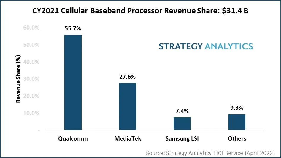 联发科、三星LSI、紫光展锐和英特尔,占据了2021年全球基带芯片市场收益份额的2-5名。整个市场收益同比增长了19.5%,达到314亿美元。