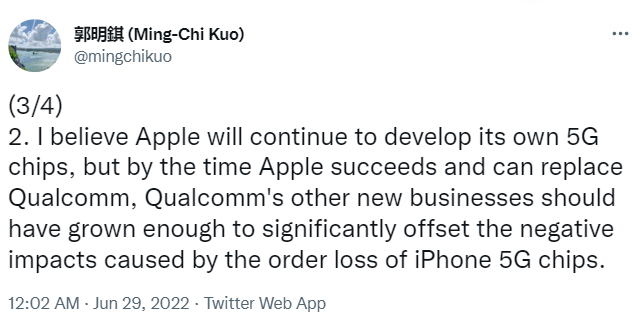 “但等到苹果成功并能够取代高通时,高通的其他新业务应该已经发展到足以显著抵消iPhone 5G芯片订单丢失带来的负面影响。”郭明錤表示。