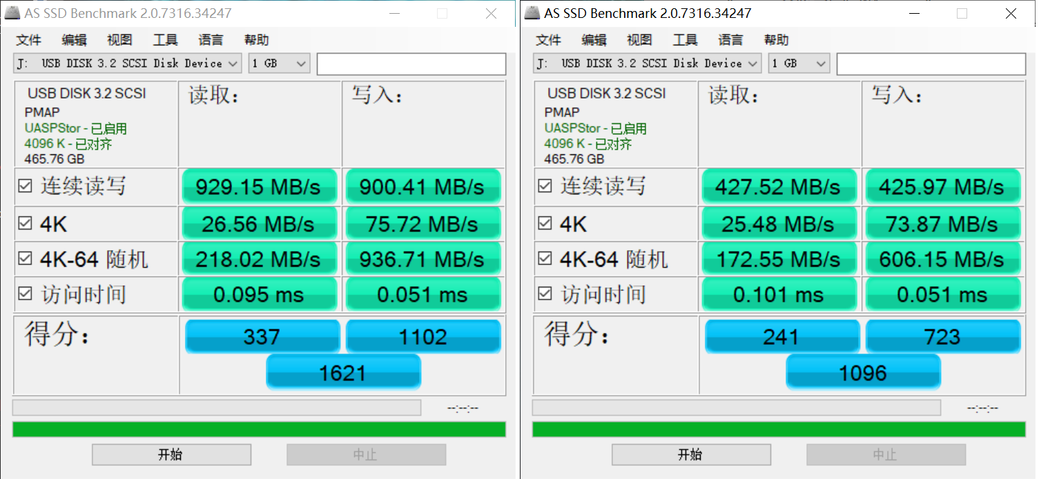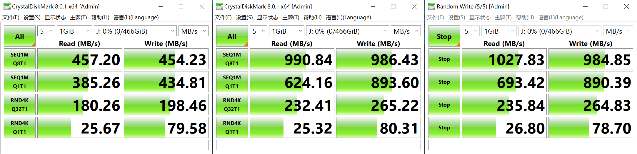利用经常使用的CrystalDiskMark来进行硬盘测试,可以看到在第一个后面两个数据有差别,这是应为第一个的usb 接口不支持10G的传输,后两个分别是支持10G的usb 和Type-C接口,跟官方的理论值没什么偏差。