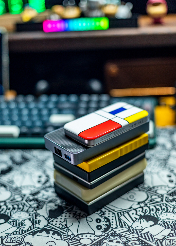 比如下面这张图里就有一个很吸睛的一块移动硬盘,这也是今天我们要说的主角--ORICO奥睿科 蒙太奇MTQ 固态移动硬盘。