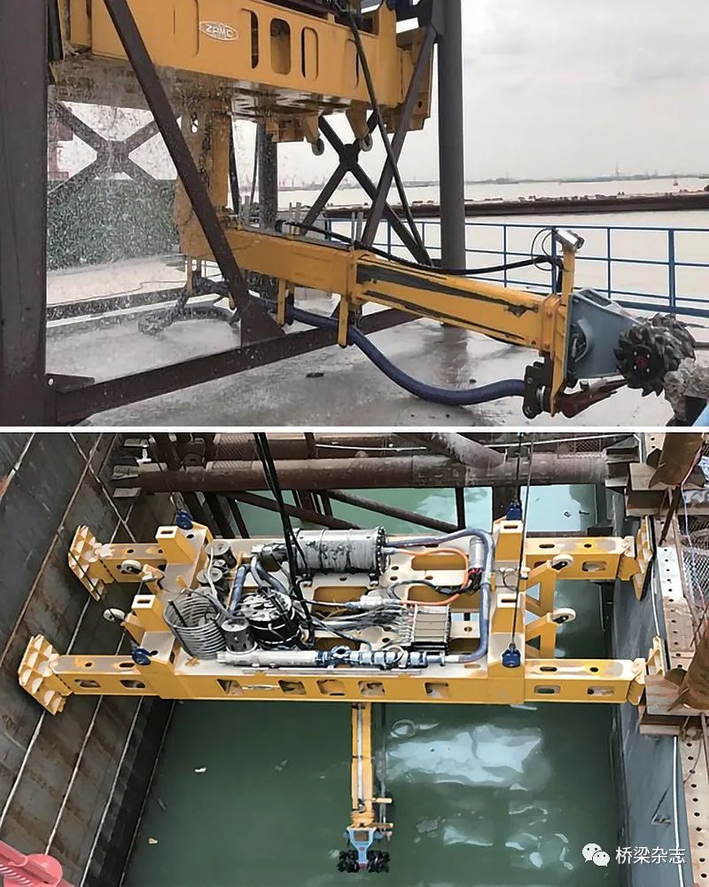 针对坚硬土层,实验室研制了深水沉井机械臂水下定点取土机器人,通过机械臂的回转、伸缩、变幅运动,以及高精度传感器测量数据实时解算出铣刨头与沉井刃脚的空间位置,实现沉井盲区定点取土,并使整个过程可视、可控。