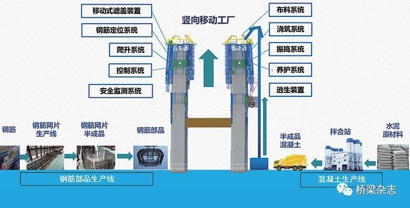 为改进桥梁超高索塔传统现场作业工艺,实验室以“工厂化生产、装配化施工、智能化控制”为总体思路,提出将桥塔高空现场施工打造为多功能一体化的“竖向移动工厂”,将绝大部分钢筋绑扎转入地面工厂,通过融合装配化、自动化、信息化和智能化技术,最终形成超高混凝土桥塔工业化建造技术。以制作工业化产品的标准提升现场施工品质,并通过自动化减人、机械化换人、智能化替人等方式显著提升工程建造品质及效率,保障施工安全。