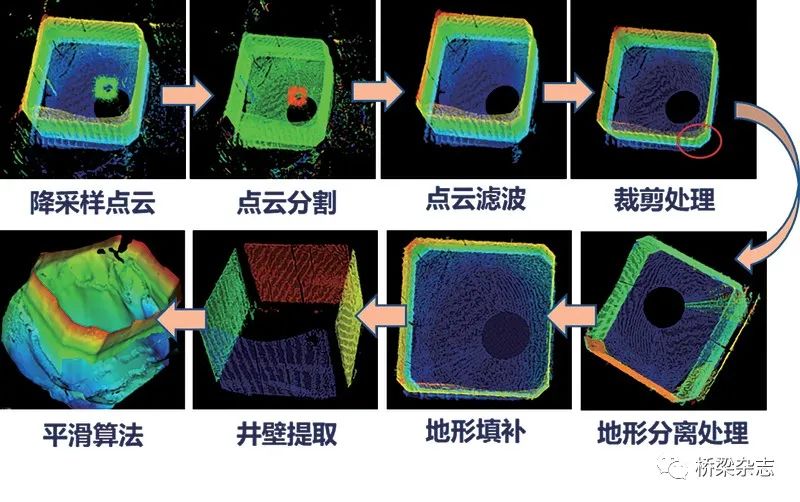 经过努力,实验室制成沉井下沉侧阻力监测装置。该装置尺寸仅有10cm×10cm×8cm,量程200KPa,测量精度可达到1%,可实现沉井下沉过程中侧摩阻力高精度直接测量。基于超大型沉井下沉理论及台阶式取土工艺,在沉井关键部位布设数据采集及传输元器件,建立无线自动化数据采集网络,实现了沉井施工全过程关键参数实时采集。技术人员还研发了水下地形扫描数据快速处理算法,形成了泥面三维形态快速处理技术,单井孔点云数据处理耗时从1小时缩短为3分钟,实现了浑浊水体中沉井底部各区域泥面三维形态的准实时可视化监测。