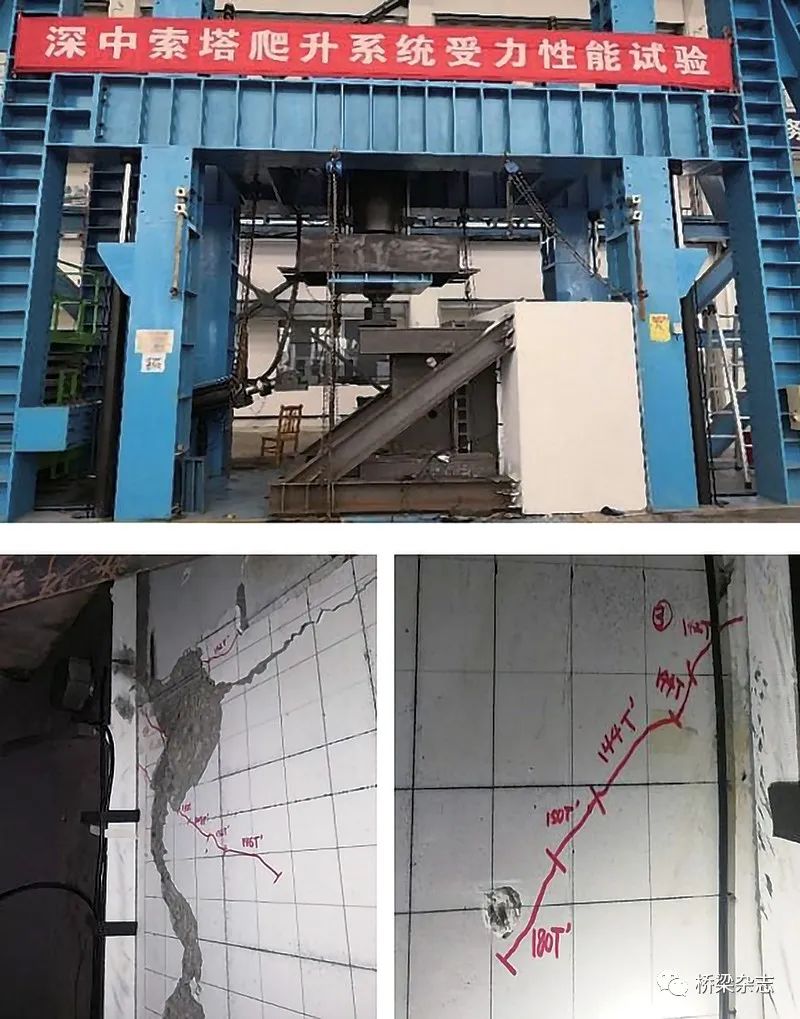 超高混凝土桥塔一体化智能筑塔机,集模架爬升、混凝土布料、辅助振捣、智能养生、应急避险和安全监控功能于一体。根据多功能一体化筑塔机,自重大的特点,实验室开展了足尺试验,研究了桥塔爬升系统的承载能力和破坏形式规律,结合高塔构造特点研发大承载能力的爬升装置,为实现筑塔专用设备多功能集成提供基本条件。同时,为减少埋件系统对混凝土外观质量的影响,采用少支点爬升及其锚固系统。