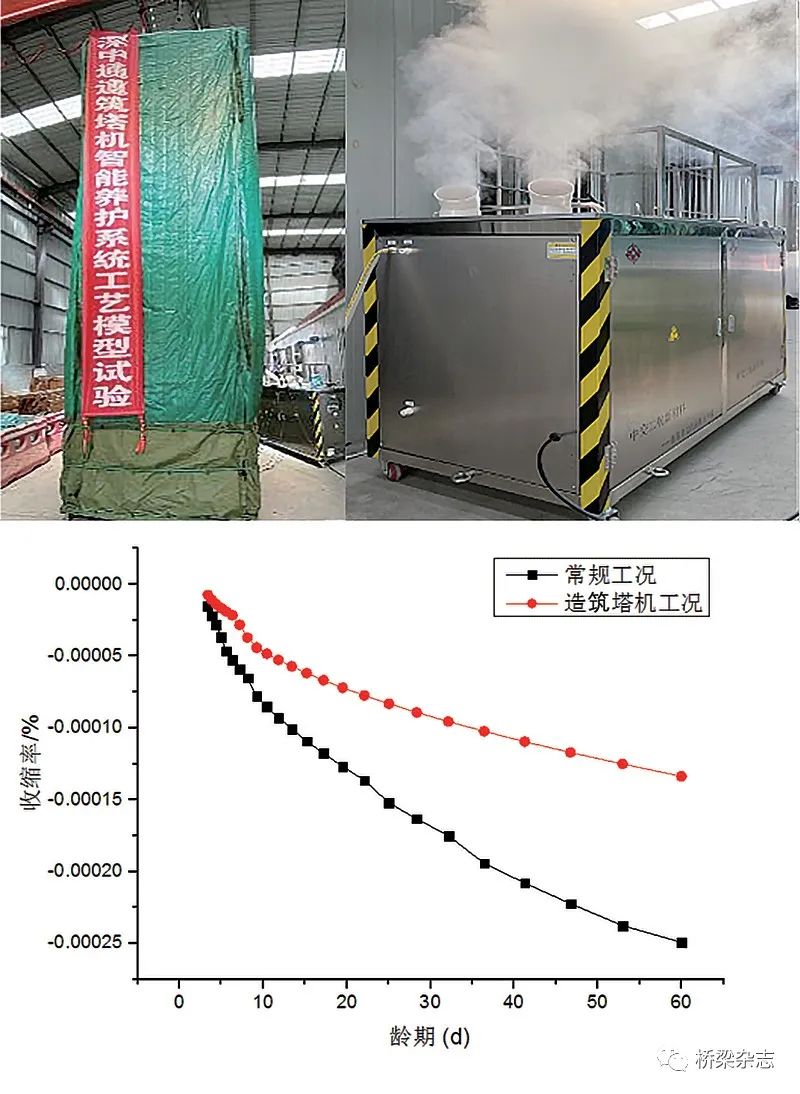 针对桥塔保温保湿及养护困难的弱点,实验室进行了超高混凝土桥塔一体化智能筑塔机智能养护系统工艺模型试验。智能热雾养护系统由封闭围护幕布系统和热雾养护系统组成。热雾养护系统包括温、湿度可调节的热雾生成设备,通过设置温控阈值(浇筑温度上限28℃,最高温度上限65℃,内表温差上限25℃)。有效保证混凝土养护质量。采用喷雾养护,可将养护湿度保证在85%左右,保湿养护时间从3天延长至7天。试验结果表明,混凝土60天收缩减少46%。混凝土渗透系数大幅降低,结构耐久性和外观质量得以显著提高。