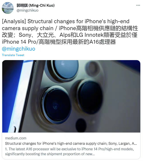 今日,天风证券分析师郭明錤也发文称,仅两款iPhone 14 Pro/高端机型采用最新的A16处理器,这将大幅推升2H22新款iPhone高端机型的出货比例至约55-60% (过去40–50%)。