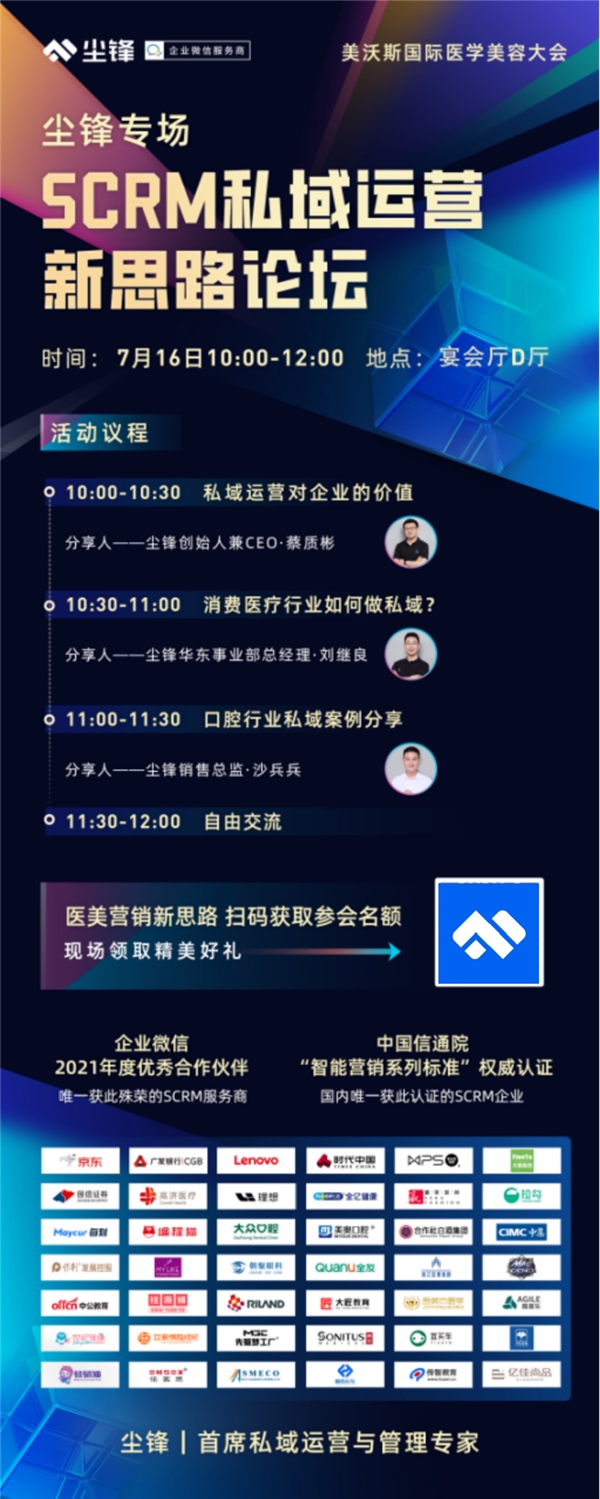 尘锋相关负责人介绍,“SCRM私域运营新思路论坛”将于7月16日上午10:00-12:00在杭州国际博览中心大宴会厅D厅举行。由尘锋创始人兼CEO蔡质彬领衔的专家分享团,将聚焦数字时代医美行业的营销困境,解析私域运营对医美企业的价值,探索医美私域运营的落地办法,分享标杆性医美企业的私域运营实践案例,为医美企业营销变革提供新的发展思路。作为SCRM行业的领军企业,首席私域运营与管理专家尘锋已在全国拥有13个城市中心,覆盖华北、华中、华东、华南、西南五大区域,为超30个行业的10,000+家企业提供覆盖售前咨询、销售转化、交易管理、增长运营全流程的私域运营与管理服务,其中不乏美莱医美、美奥口腔、高济医疗等消费医疗领域的代表性企业,深谙医疗、美容行业营销策略,受到企业伙伴的高度好评。