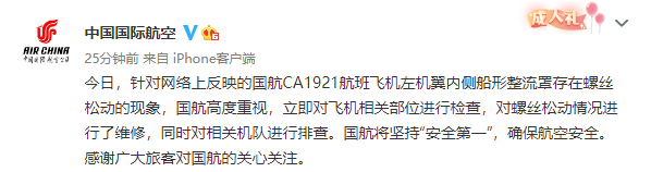 中国国际航空7日在微博表示,针对网络上反映的国航CA1921航班飞机左机翼内侧船形整流罩存在螺丝松动的现象,国航高度重视,立即对飞机相关部位进行检查,对螺丝松动情况进行了维修,同时对相关机队进行排查。国航将坚持“安全第一”,确保航空安全。