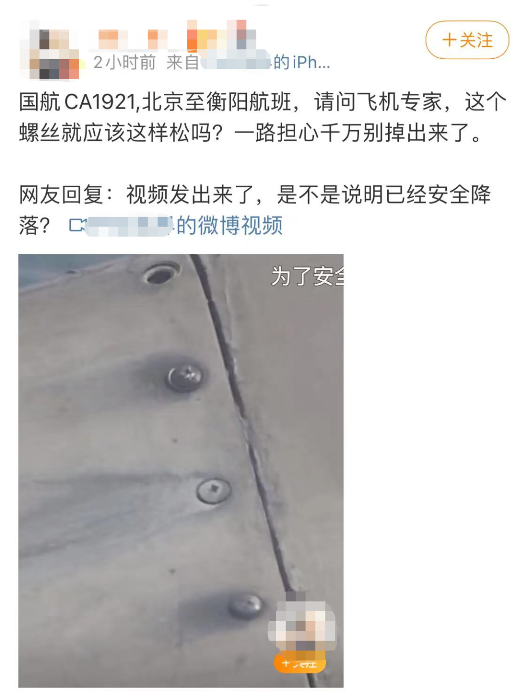 7日,有网友在网络上发布视频称,飞行中的国航CA1921航班飞机机翼螺丝松动,引发关注。