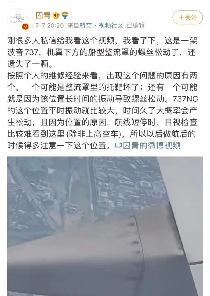 这是一架波音737,机翼下方的船型整流罩的螺丝松动了,还遗失了一颗。按照个人的维修经验来看,出现这个问题的原因有两个。一个可能是整流罩里的托靶坏了;还有一个可能就是因为该位置长时间的振动导致螺丝松动。737NG的这个位置平时振动就比较大,时间久了大概率会产生松动,且因为位置的原因,航线短停时,目视检查比较难看到这里(除非上高空车),所以以后做航后的时候得多注意一下这个位置。