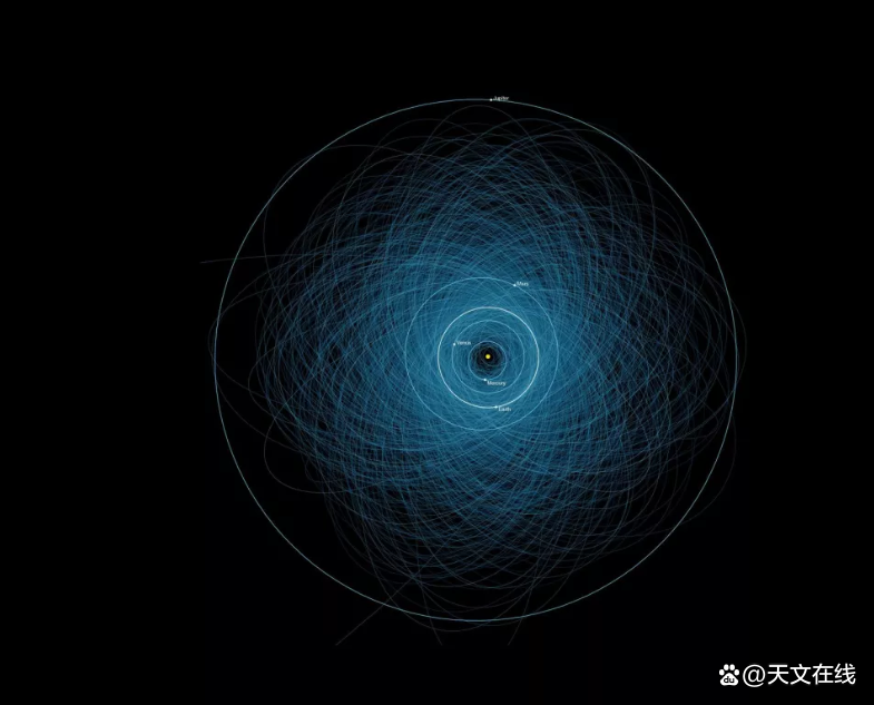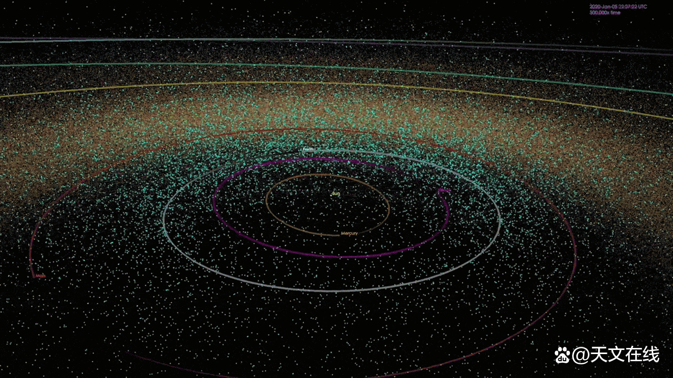 动画展示了截至2018年1月发现的近地小行星的位置;地球的轨道用白线标出。(图片来源:美国国家航空航天局/加州理工学院/喷气推进实验室)