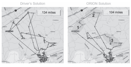 在上图中,左侧是驾驶员原本的路线方案,右侧是 ORION 给出的解决方案。正如您在地图上看到的,ORION 的解决方案比司机的方案要高效得多。使用 ORION 软件可以节省 30 英里的路途。