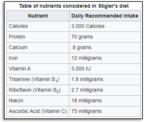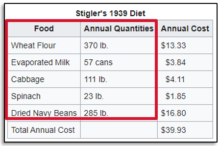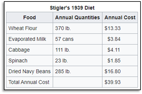 研究这个问题的经济学家乔治·斯蒂格勒发现,最佳饮食组合包括以下 5 种食物:370 磅小麦粉、57 罐炼乳、111 磅卷心菜、23 磅菠菜和285 磅海军豆。