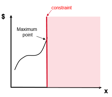 上图中,我们看到的是一个无约束优化的示例,其中最高峰是最大点,最低谷是最小点。