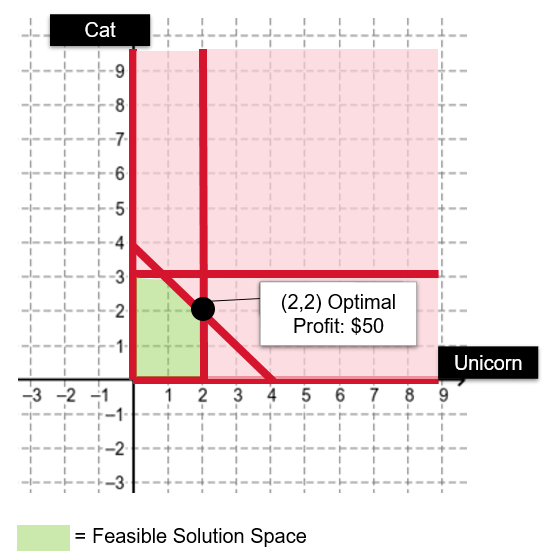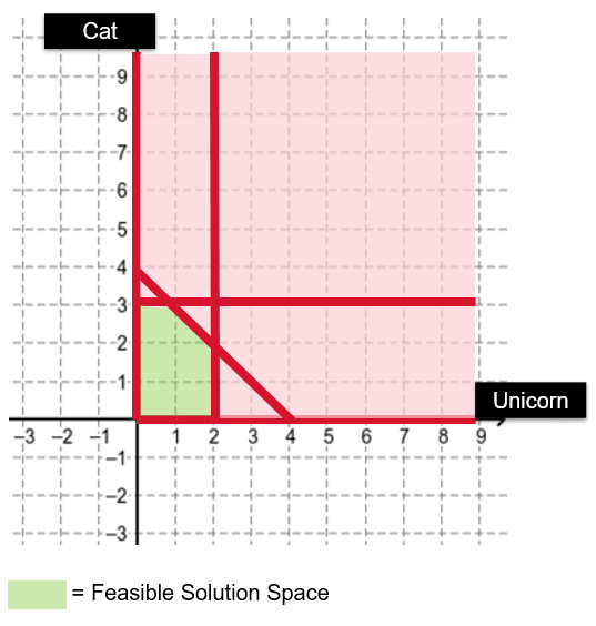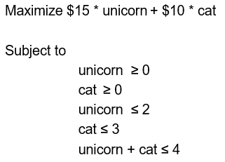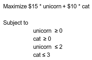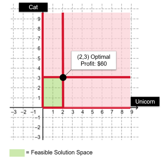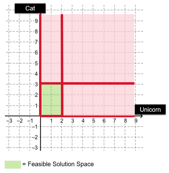 另一件值得注意的事情是,不可能生产少于 0 个独角兽抱枕或 0 个肥猫玩偶。尽管这对我们来说是直观和合乎逻辑的,但将这些约束构建到问题中是一种很好的做法。你希望避免计算机可能输出不合逻辑的解决方案的情况,例如在这种情况下的负数。