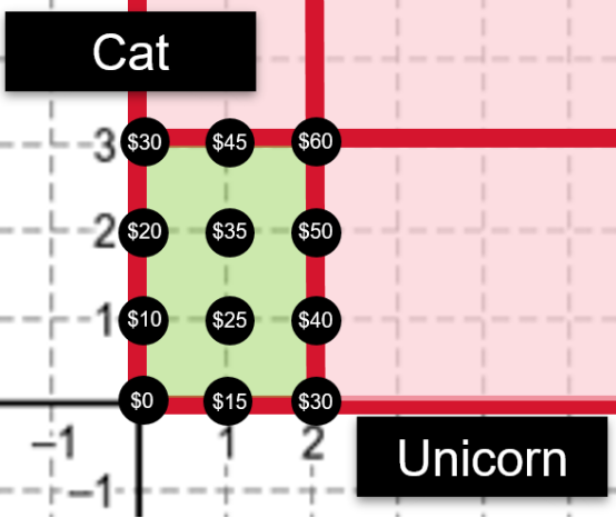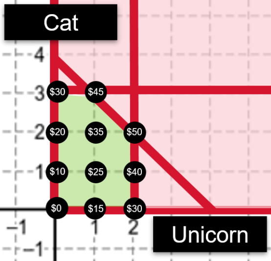 在绿色的可行解决方案空间内,我们现在想要找到要制作的最佳独角兽抱枕和肥猫玩偶的数量。请记住,独角兽抱枕的利润为 15 美元,肥猫玩偶的利润为 10 美元。如果该公司生产 1 个独角兽抱枕和 0 个肥猫玩偶,它将赚 15 美元。如果该公司生产 2 个独角兽抱枕和 1 个肥猫玩偶,它将赚 40 美元。等等。