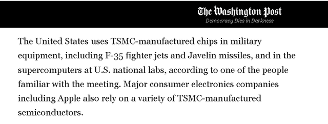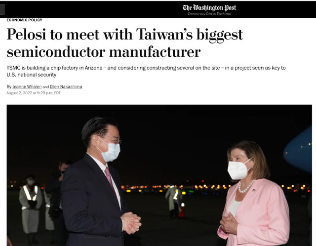 熟悉佩洛西和刘德音会谈情况的知情人士更明确对《华盛顿邮报》表示,台积电制造的芯片被美国广泛用于包括F-35战斗机等军事设备中,美国国家实验室的超级计算机也使用台积电的芯片。诸如苹果公司在内的美国消费电子产品公司也依赖台积电生产的多种芯片。