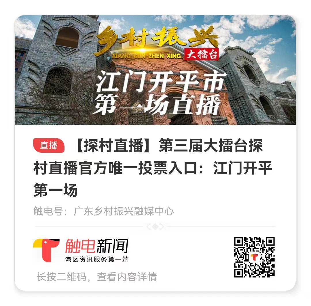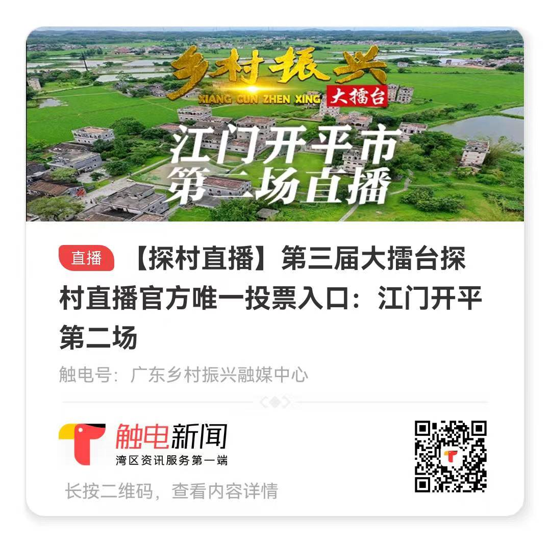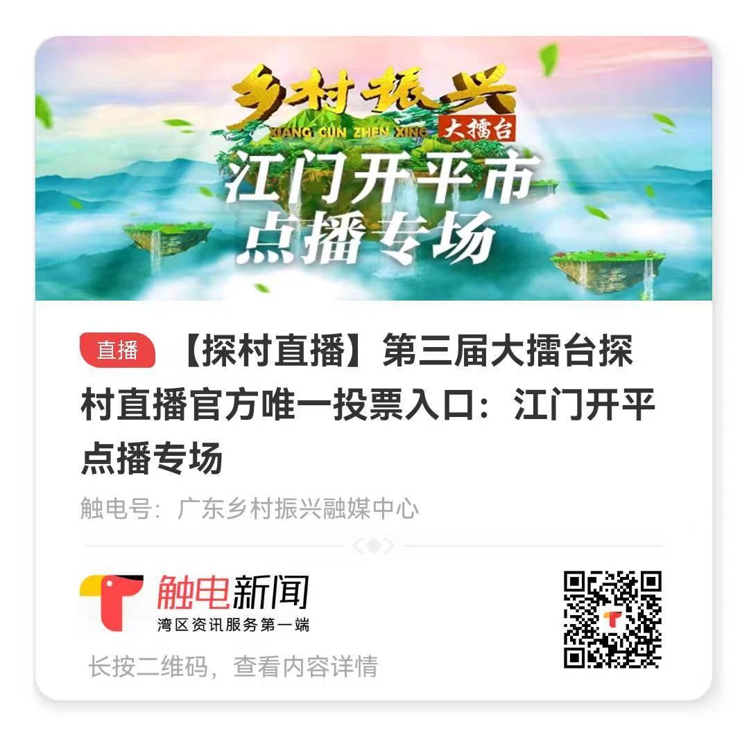 搜索微信公众号“广东美丽乡村建设”, 点击“服务”菜单栏中的“乡村振兴大擂台”进入,找到“江门开平|探村直播”进行点赞投票。