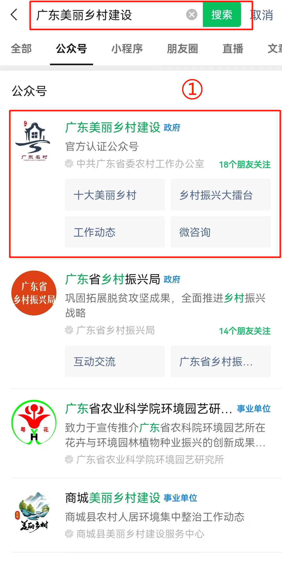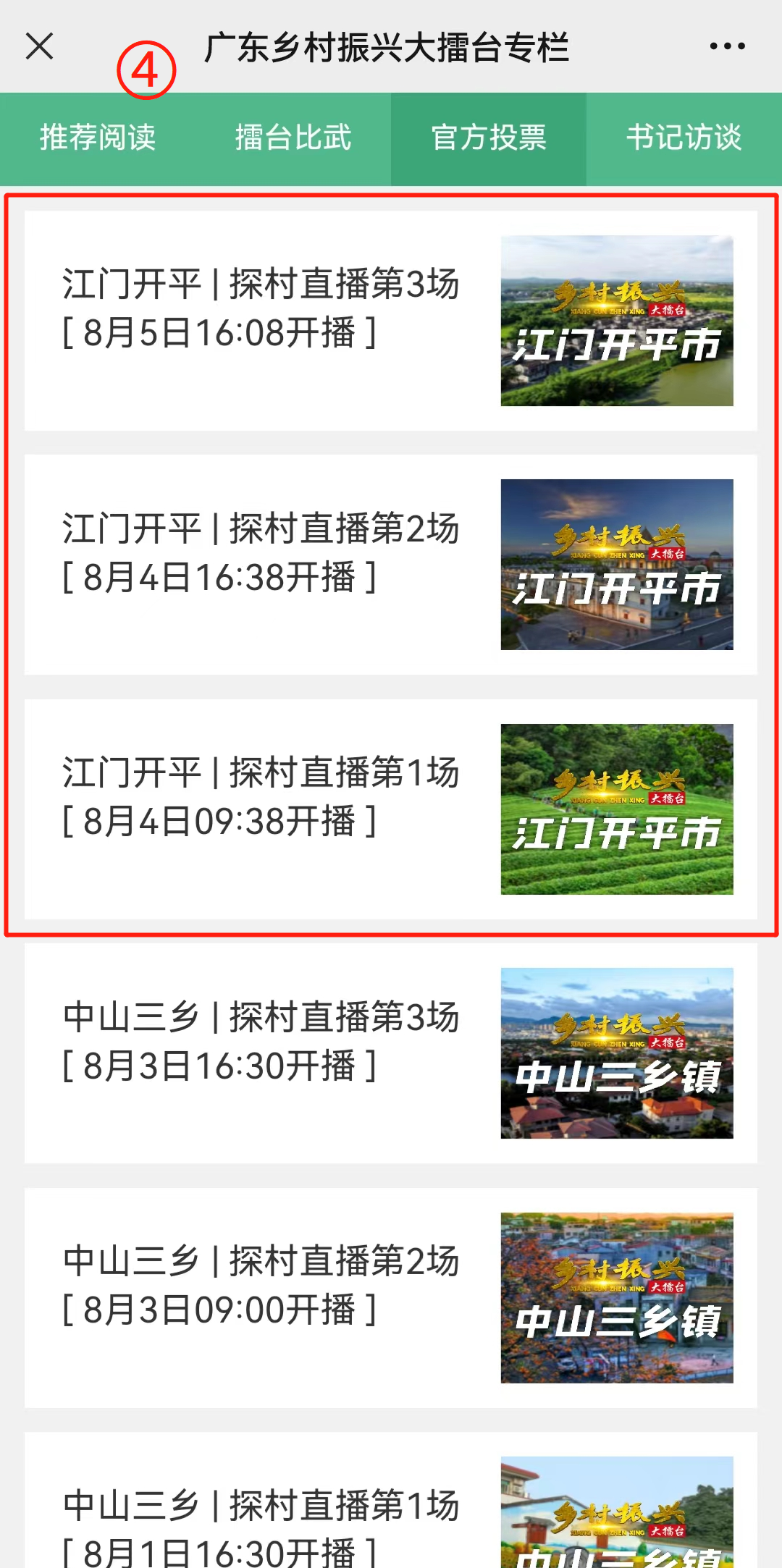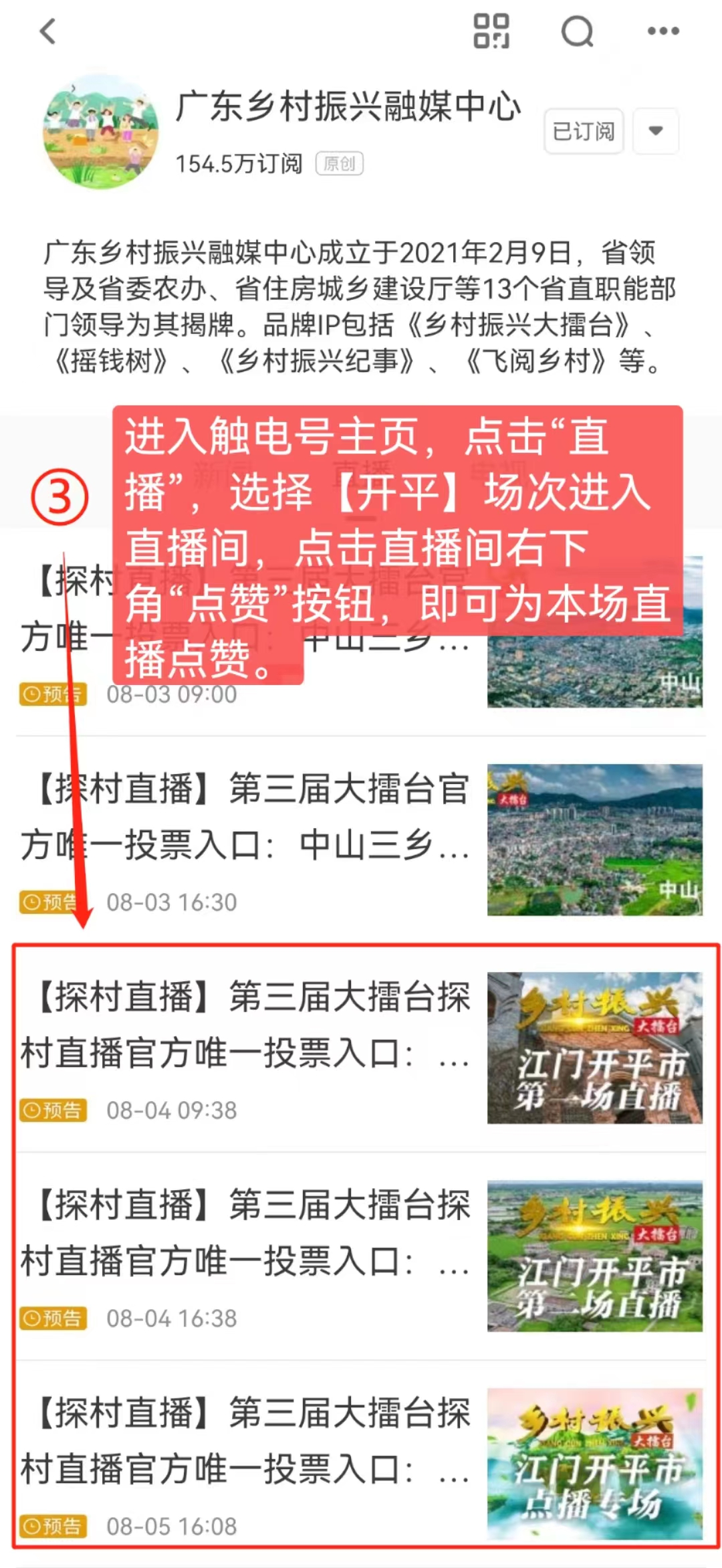 搜索微信公众号“广东美丽乡村建设”, 点击“服务”菜单栏中的“乡村振兴大擂台”进入,找到“江门开平|探村直播”进行点赞投票。