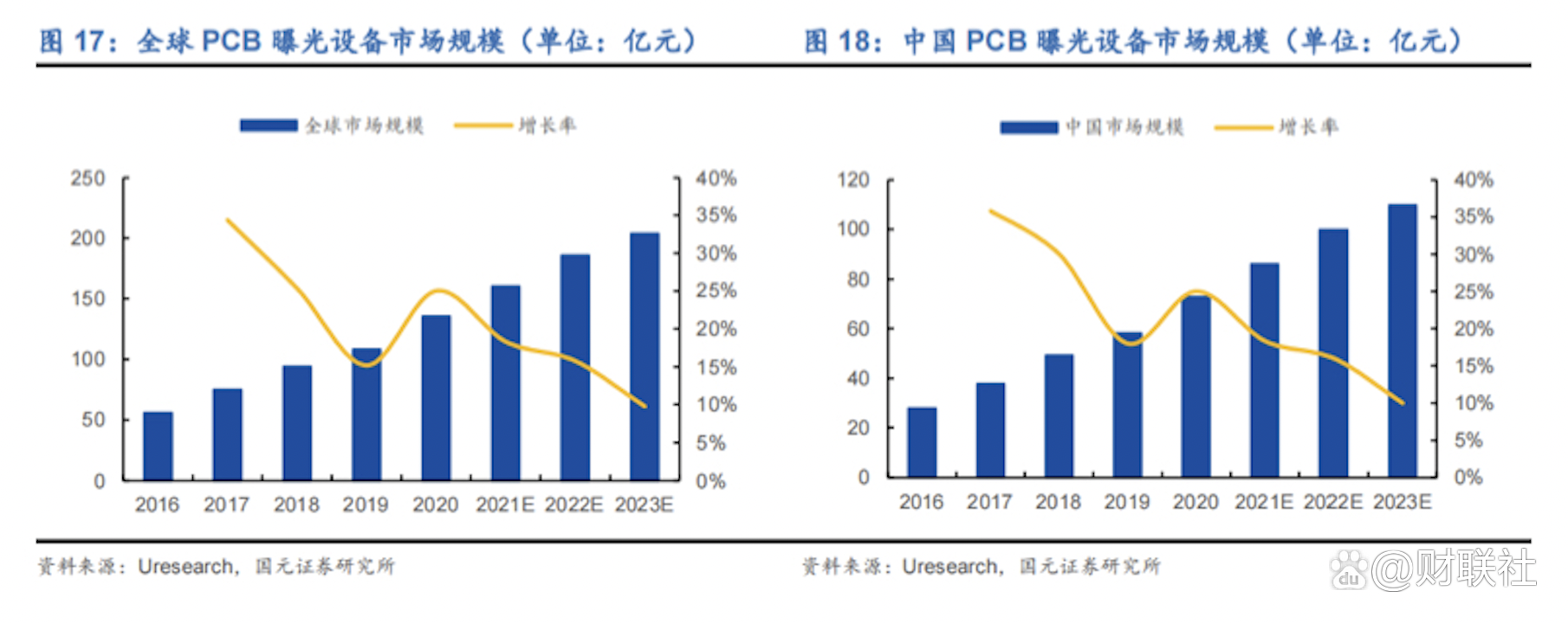 伴随着下游PCB行业的持续扩容以及PCB产业向国内的转移,我国PCB产业快速发展,汽车、服务器及数据中心等行业对PCB具有强劲的需求,带动国内众多PCB企业积极扩产,从而带来对PCB设备巨大的市场需求。根据Uresearch的预测,2023年全球PCB曝光设备的市场规模约203.81亿元,国内市场规模约109.80亿元,占比超过50%。