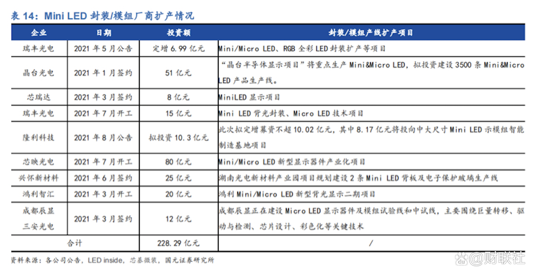 据Arizton预测,2021-2024全球MiniLED市场规模有望从1.5亿美元增至23.2亿美元,期间每年同比增速皆高达140%以上。近期MiniLED封装/模组厂商的投资金额合计228.29亿元,按照80%为设备投资,参照曝光设备占封装产线投资的6%计算,该领域带来的光刻设备需求约为10亿元。