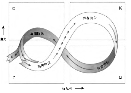 韧性不应当仅仅被视为系统对原始状态的一种简单恢复。在韧性的视角下,一个系统的发展包含了四个阶段,分别是利用阶段(exploitation phase)、保存阶段(conservation phase)、释放阶段(release phase)以及重组阶段(reorganization phase)(Holling,2001;邵亦文,徐江,2015)。在重组阶段,一个具有发展潜力的系统可以通过吸取资源等方式获得各子系统重构的机会以支撑进一步的发展,往复实现适应性的循环,实现跨越式发展。但是若不能在重组阶段完成必要的资源储备和体系建构,往往会脱离这个循环,导致系统的溃败与失效(图1)。